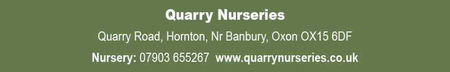 The nursery is now closed for spring, but open again from 27th August Quarry Nurseries is a small nursery sitting in a quiet corner of North Oxfordshire. I open seasonally in the Spring/early Summer and run the nursery single-handed so there is always plenty to do! As I work by myself, I sometimes need to close at very short notice in order to keep on top of the nursery work. When planning a visit, please always check the website for current opening times. Quarry Nurseries for GREAT VALUE - Dig our prices! |