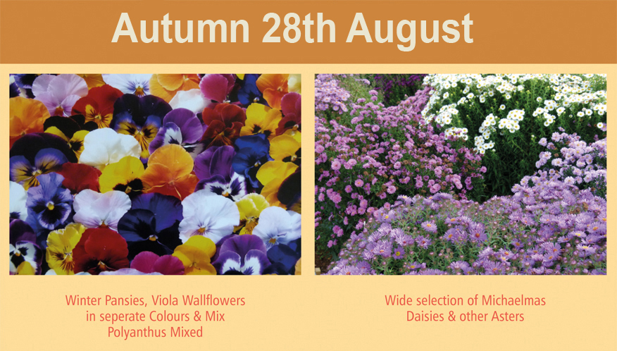 Pansies, Violas, Wallflowers and Asters This Autumn I will be growing 2 series of Winter Pansy, F1 Panola XP and the large flowered F1 Matrix, both in a wide range of seperate colours plus mixed. I will also be growing Viola F1 Sorbet-XP in a smaller number of seperate colours plus mixed. My Pansies and Viola are grown in 15 cell trays, this allows the development of good quality plants with strong individual root systems perfect for transplanting into your borders, containers or hanging baskets.